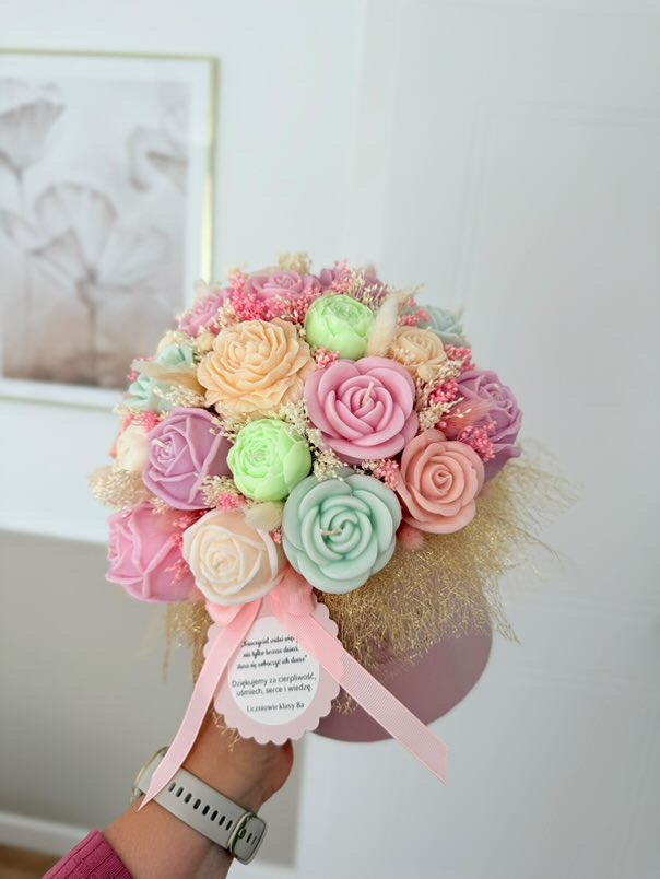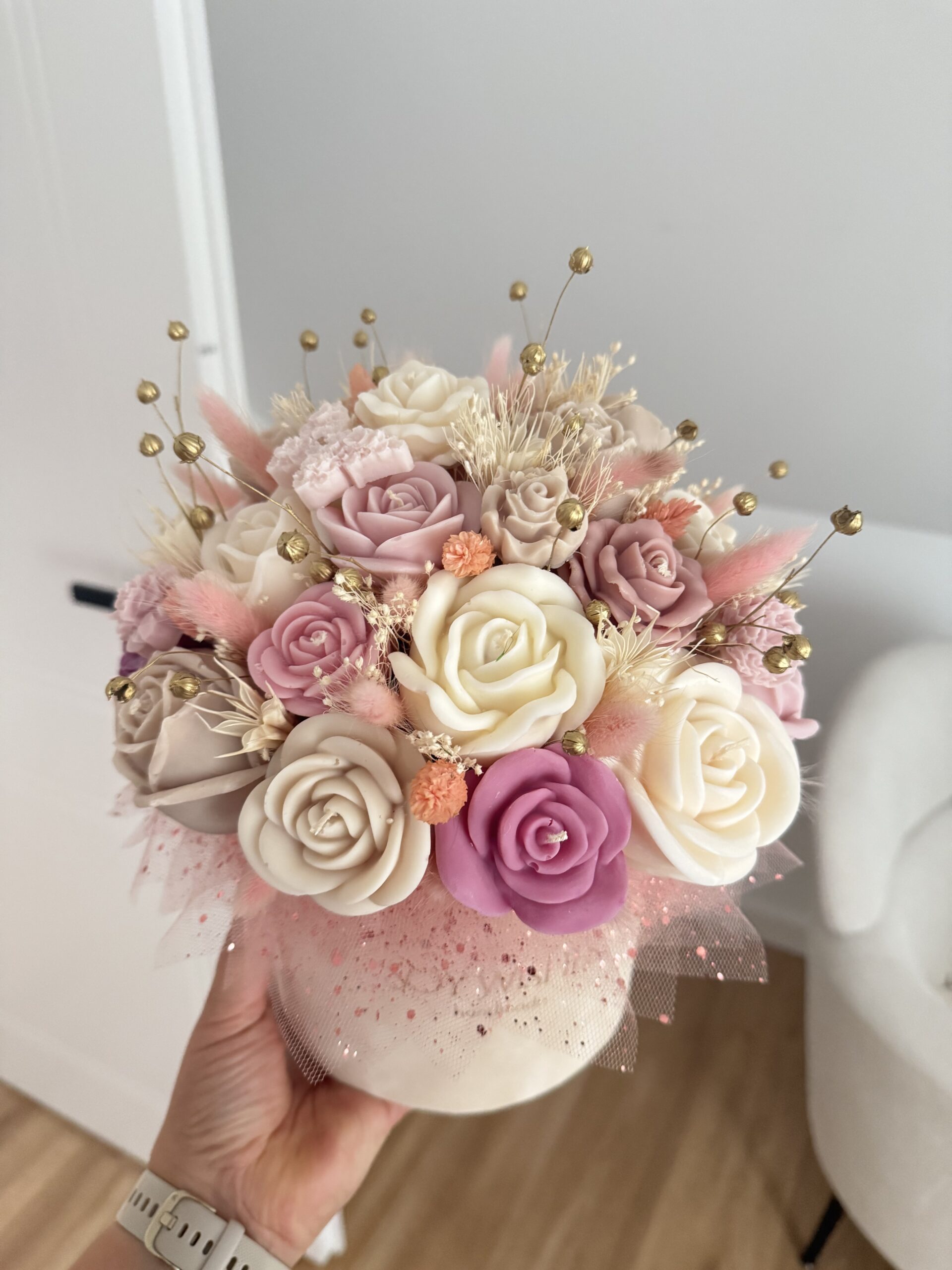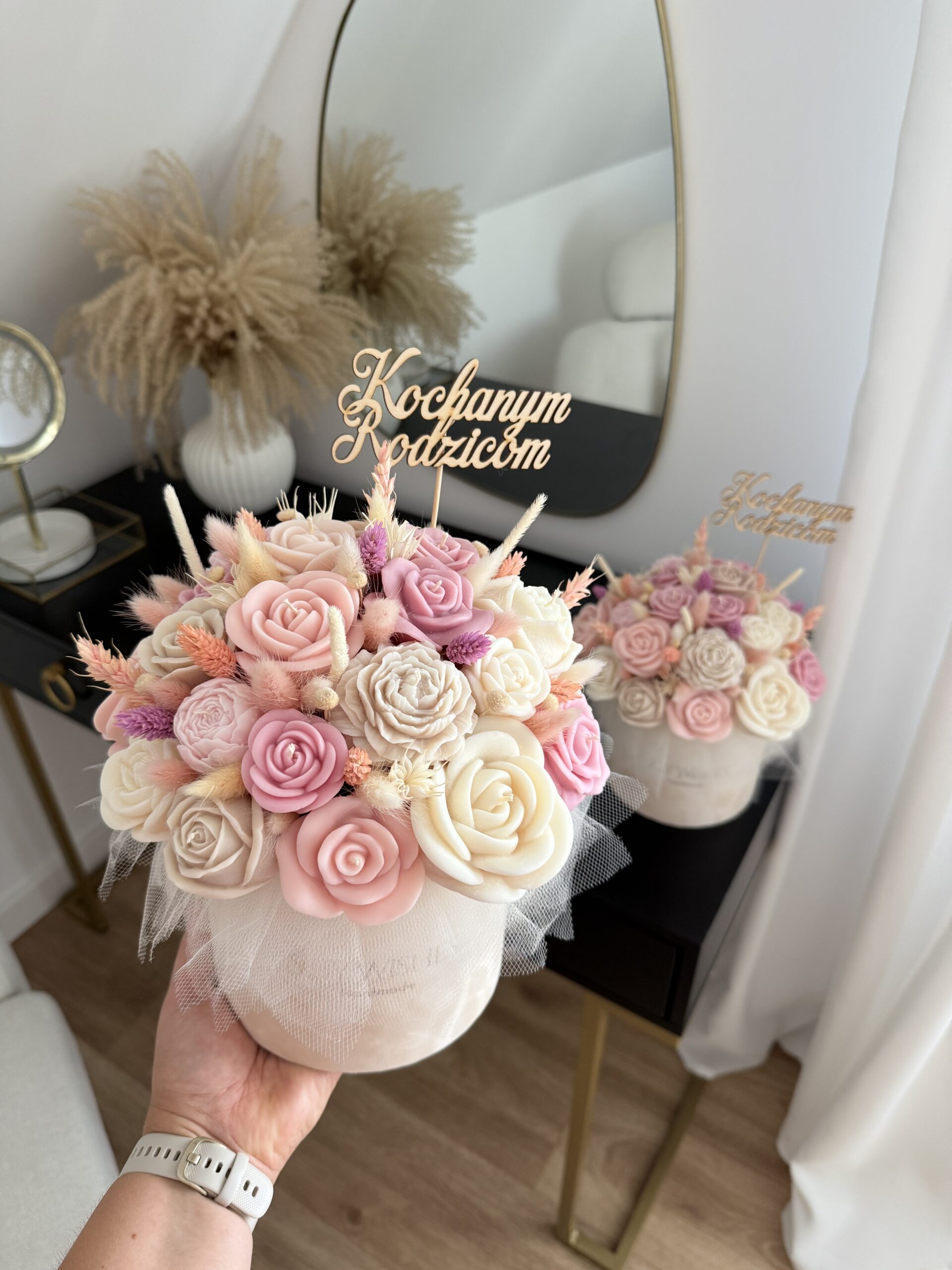 Flowerbox z wosku sojowego w eleganckim welurowym pudełku. Kompozycja doskonale sprawdzi się jako podziękowanie dla rodziców, prezent urodzinowy lub upominek dla pary młodej.