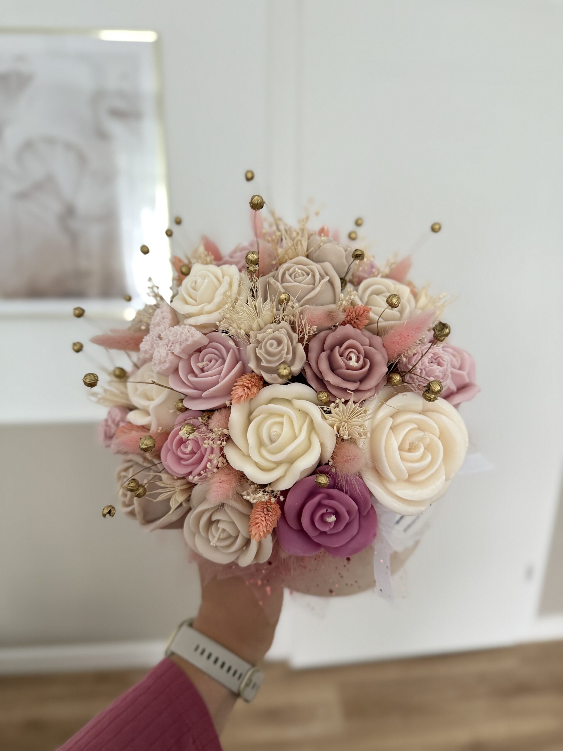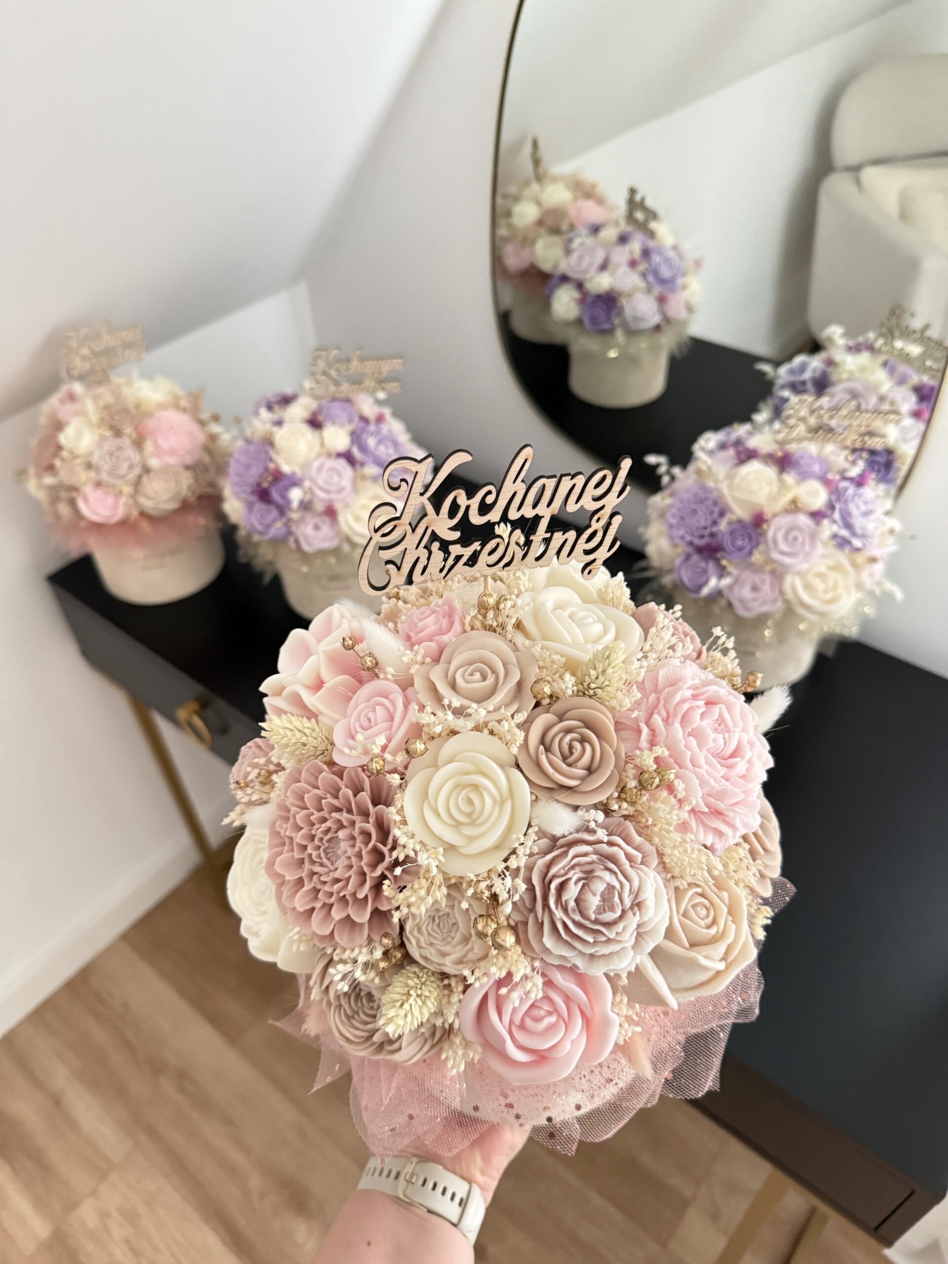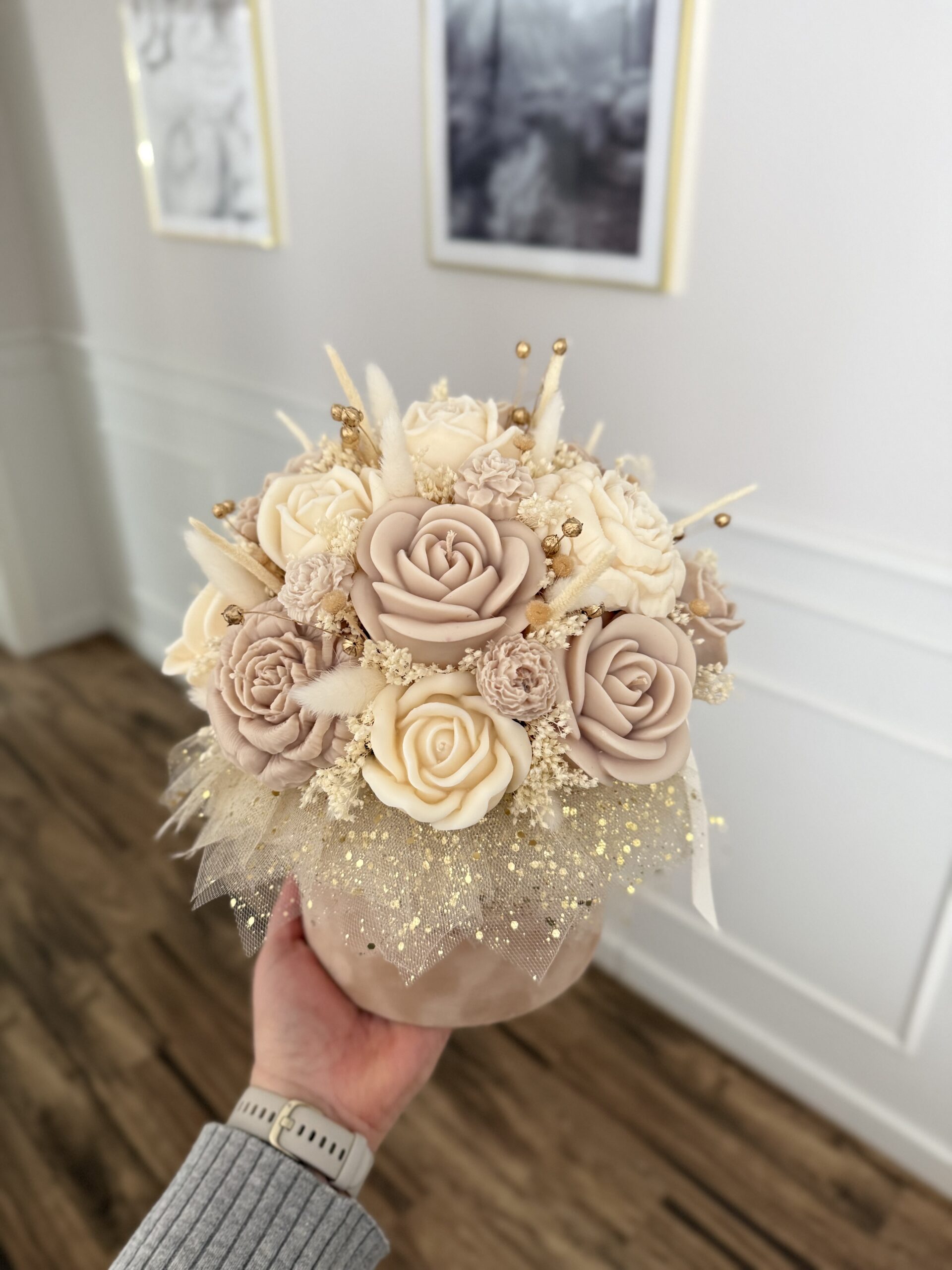 Flowerbox z wosku sojowego w eleganckim welurowym pudełku. Kompozycja doskonale sprawdzi się jako podziękowanie dla rodziców, prezent urodzinowy lub upominek dla pary młodej.