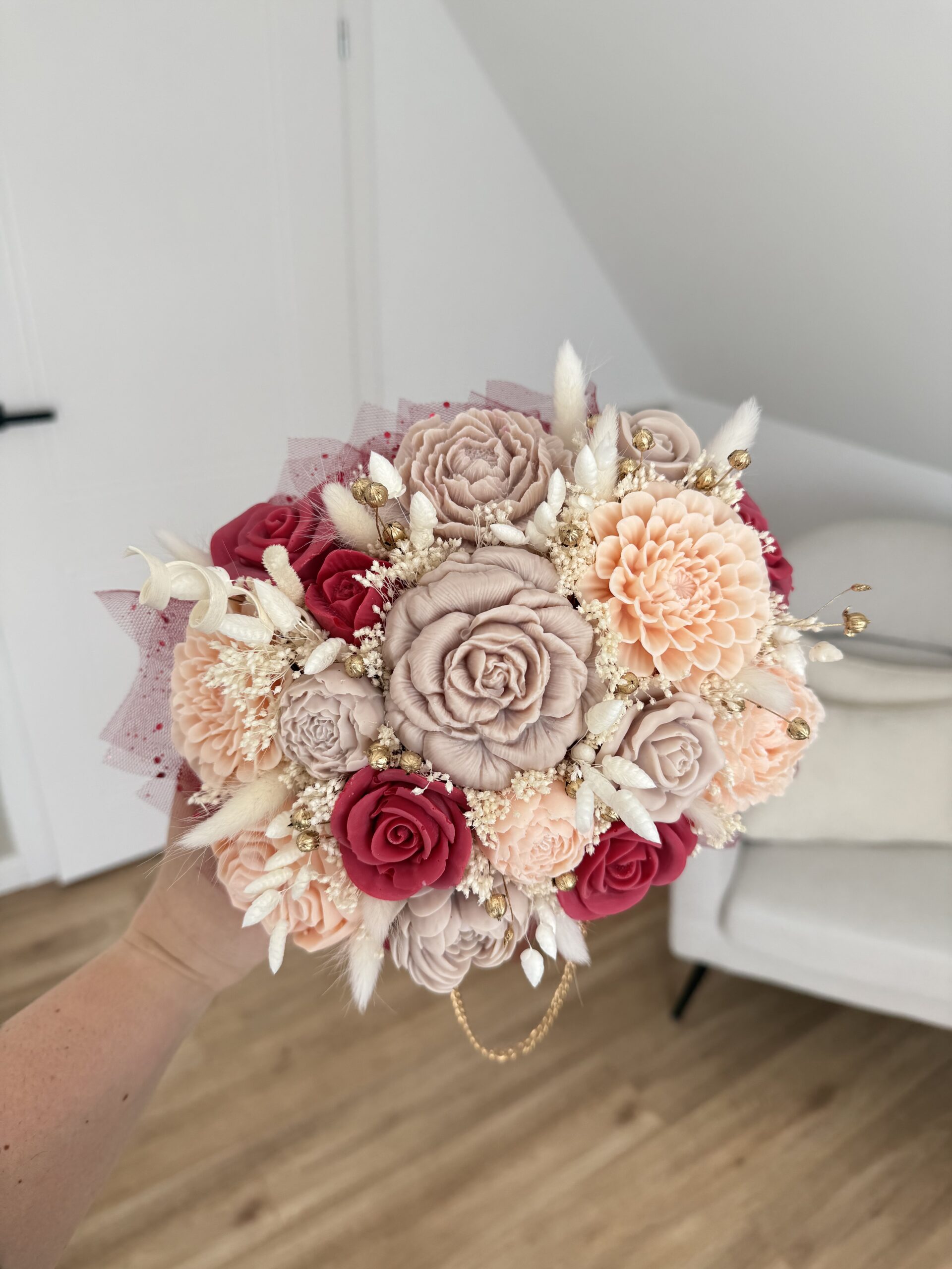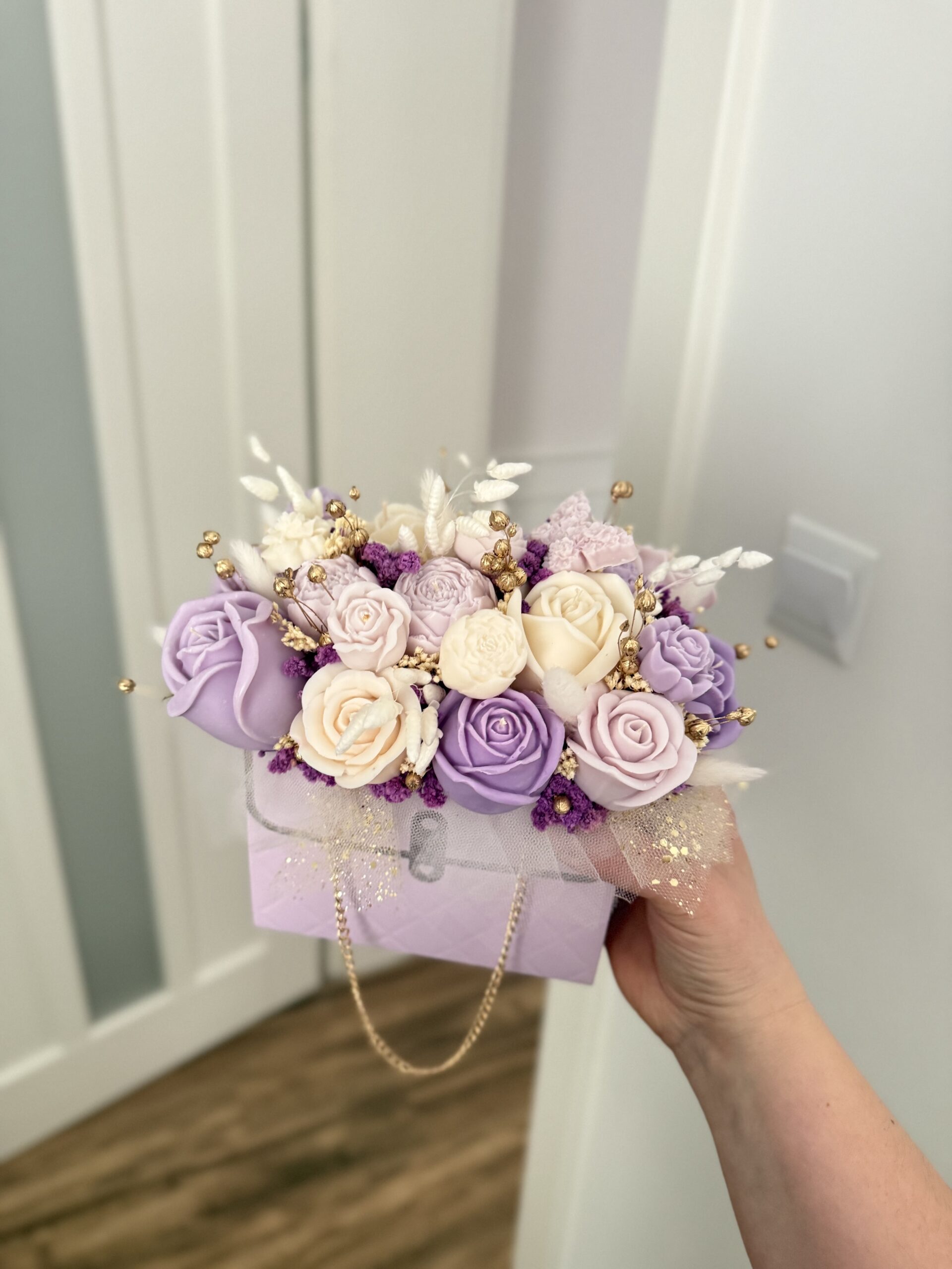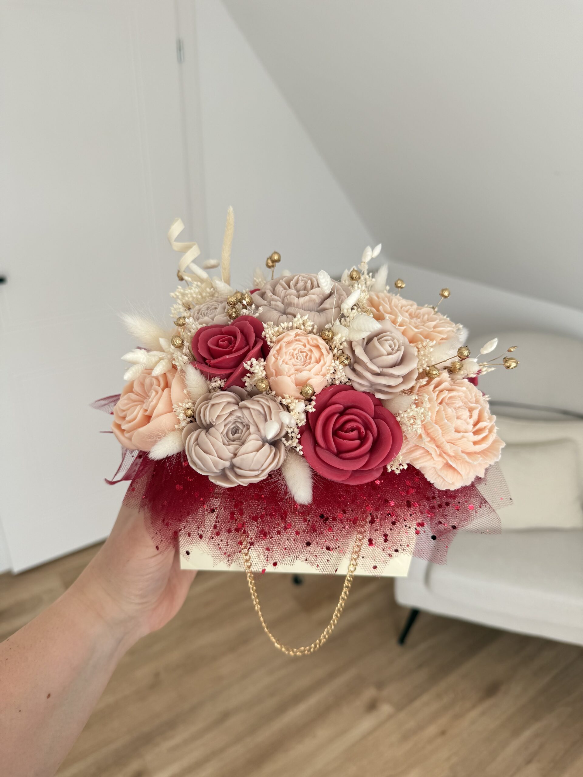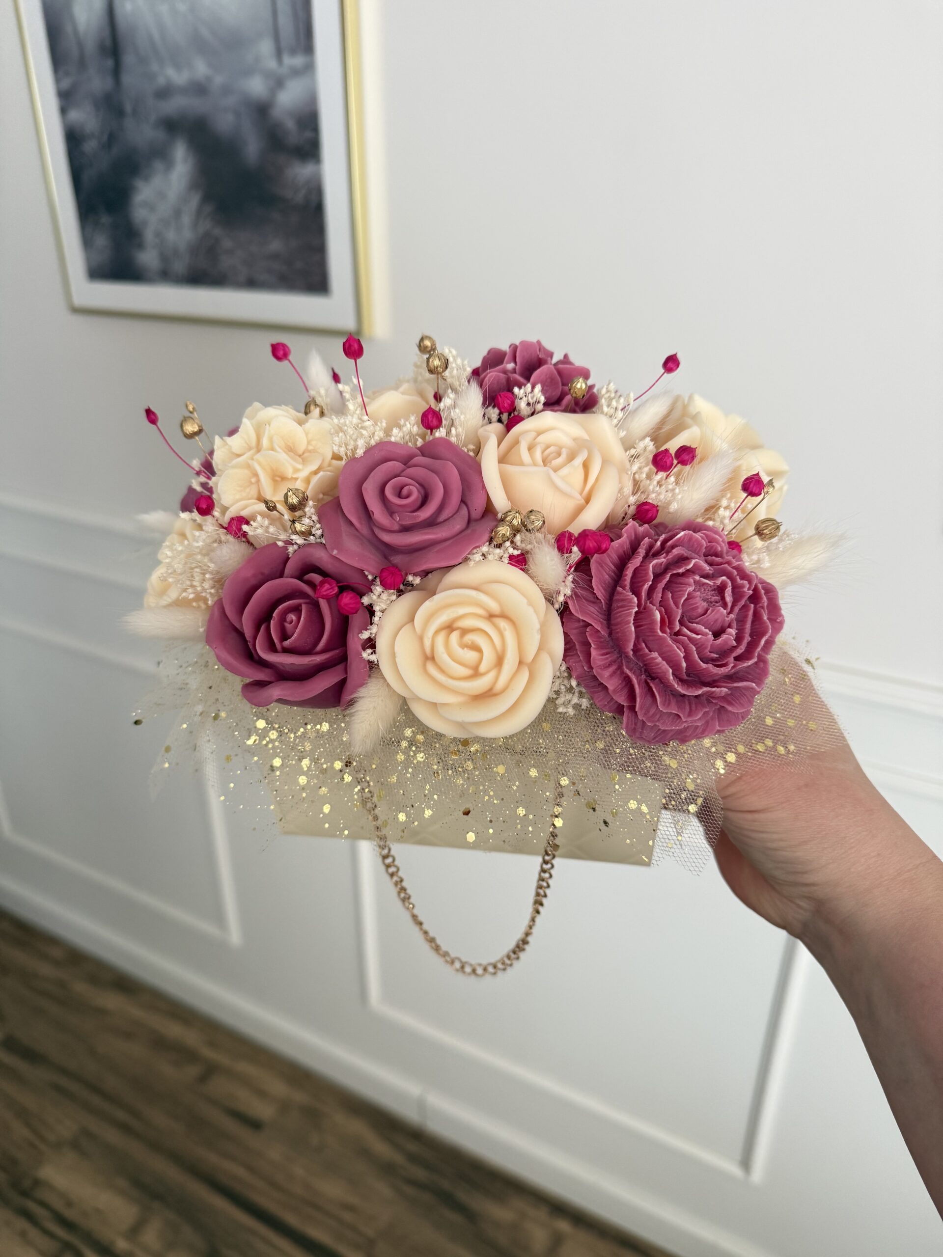 Niebanalna kompozycja z naturalnego wosku sojowego dopełniona suszonymi i stabilizowanymi roślinami w eleganckiej formie torebki.