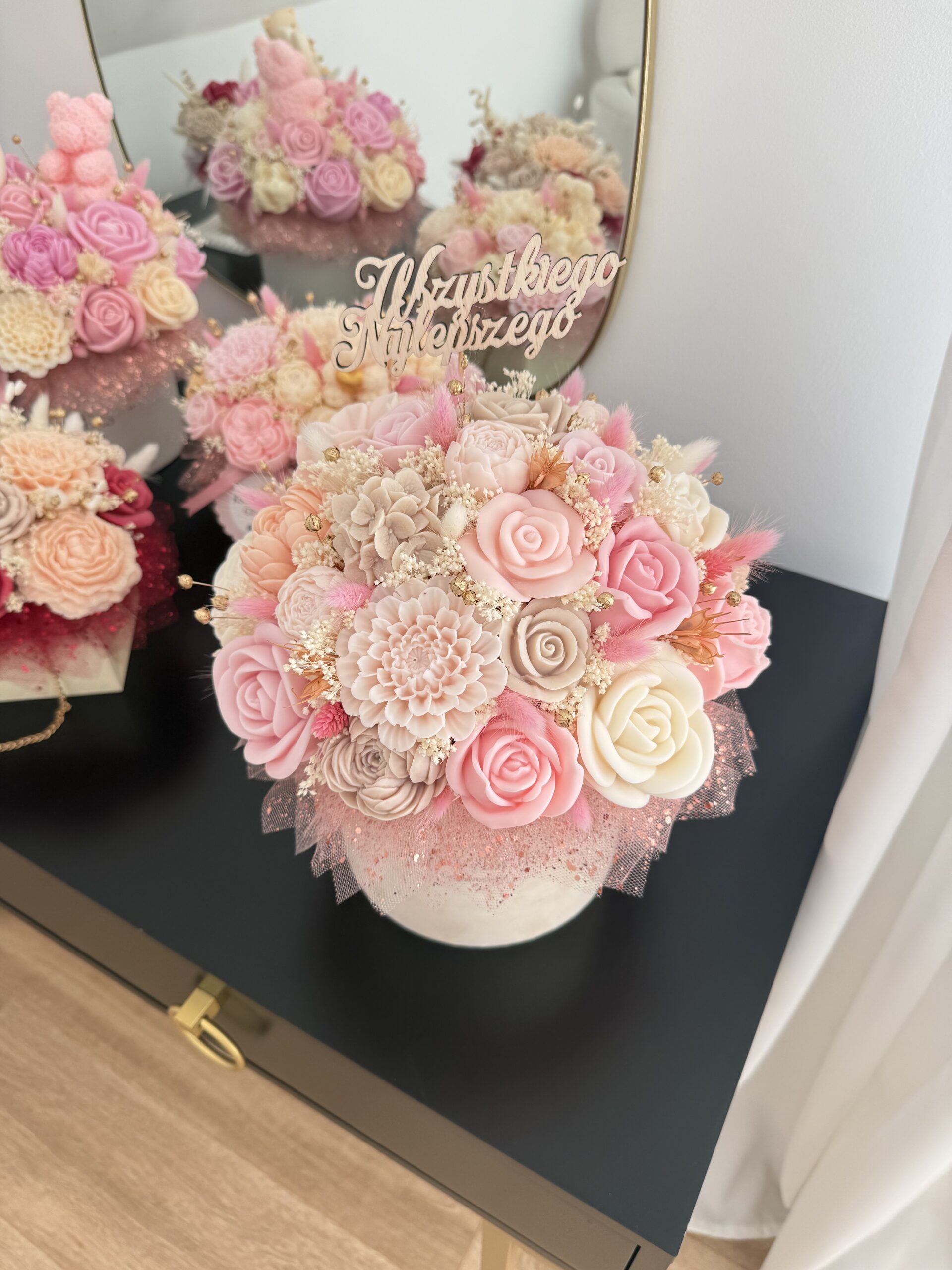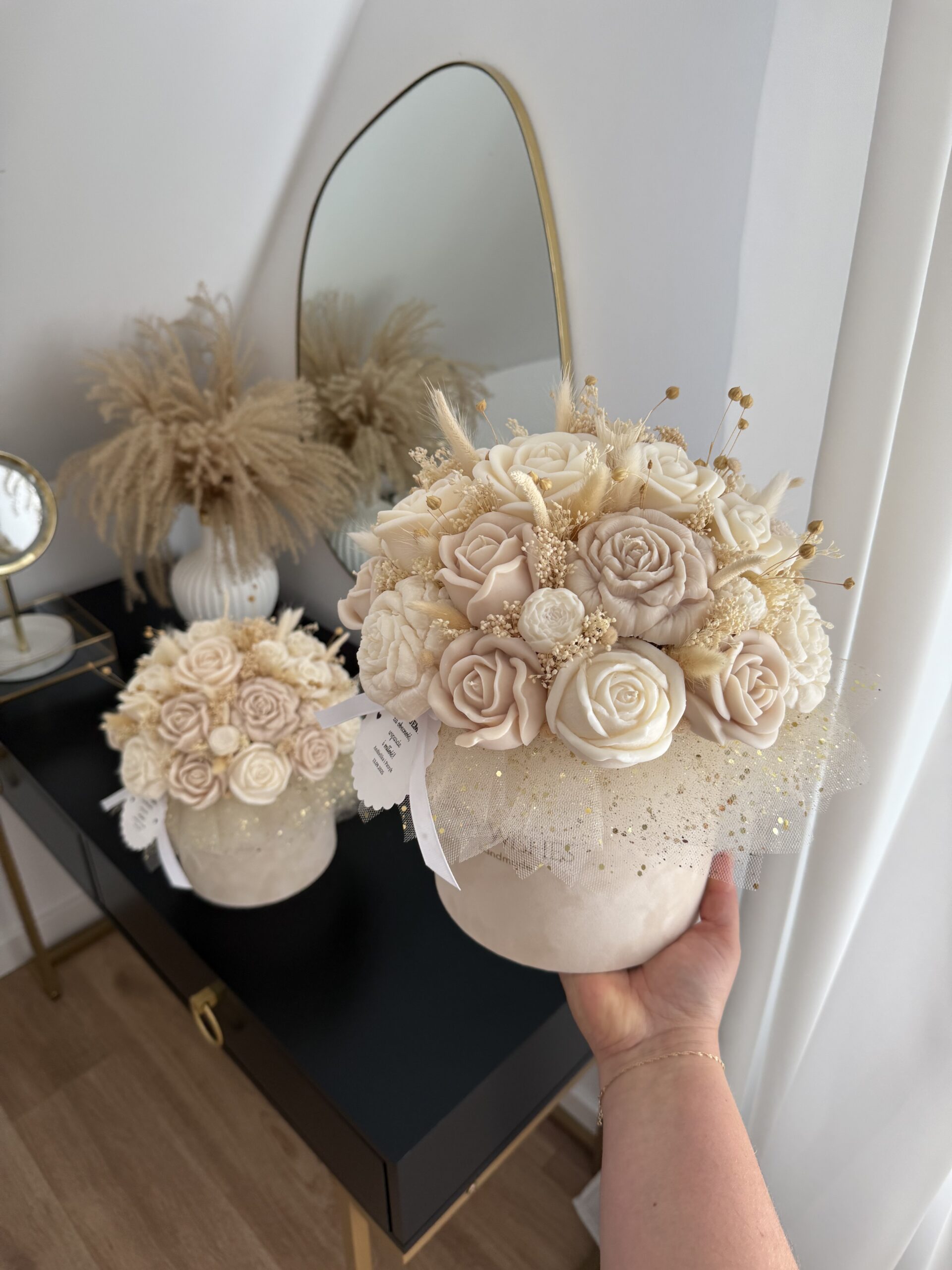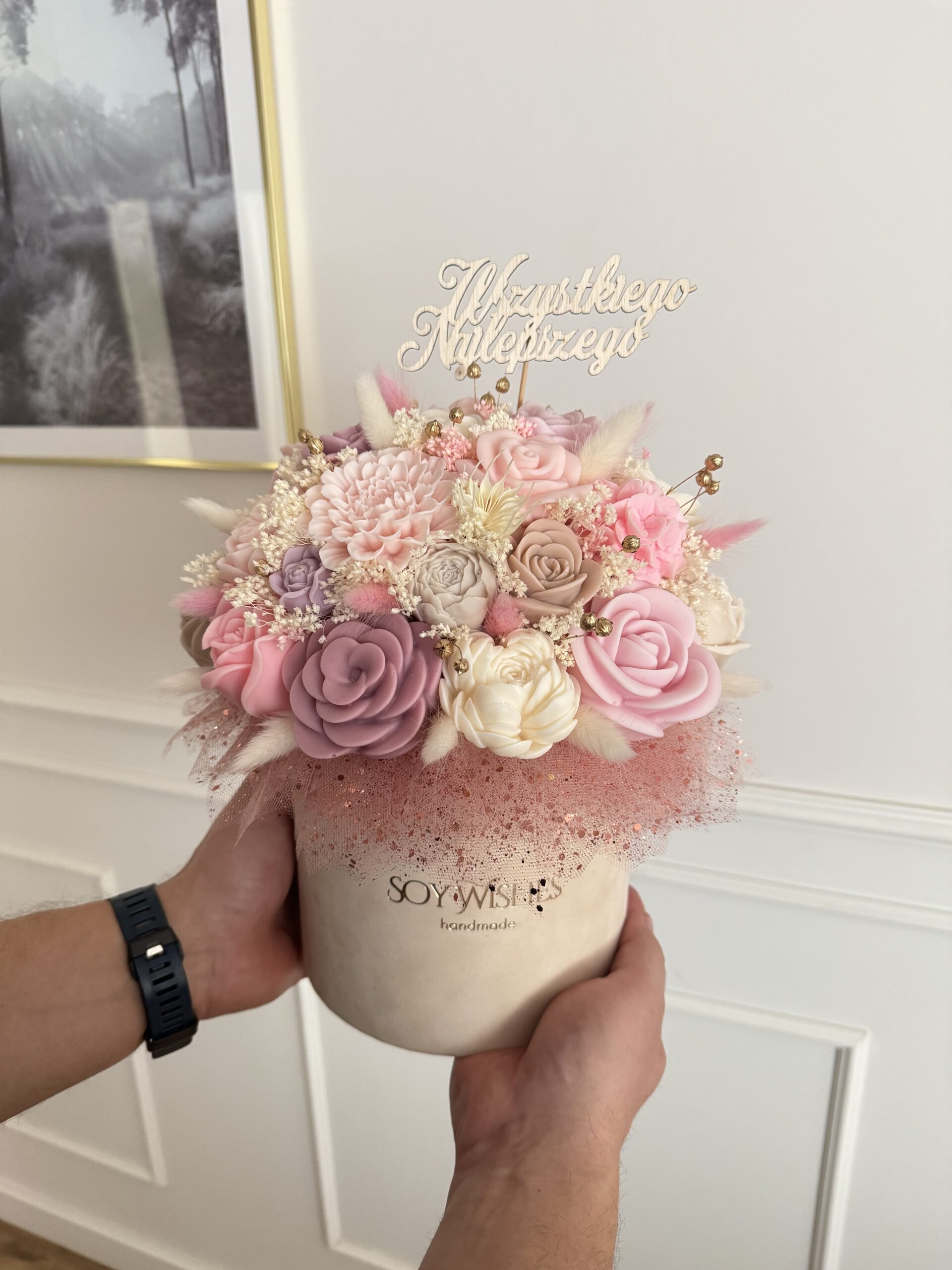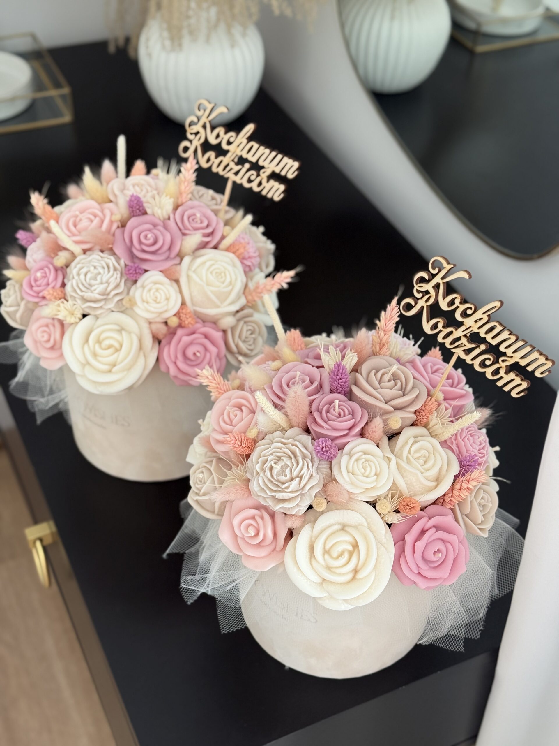 Flowerbox z wosku sojowego w eleganckim welurowym pudełku. Kompozycja doskonale sprawdzi się jako podziękowanie dla rodziców, prezent urodzinowy lub upominek dla pary młodej.