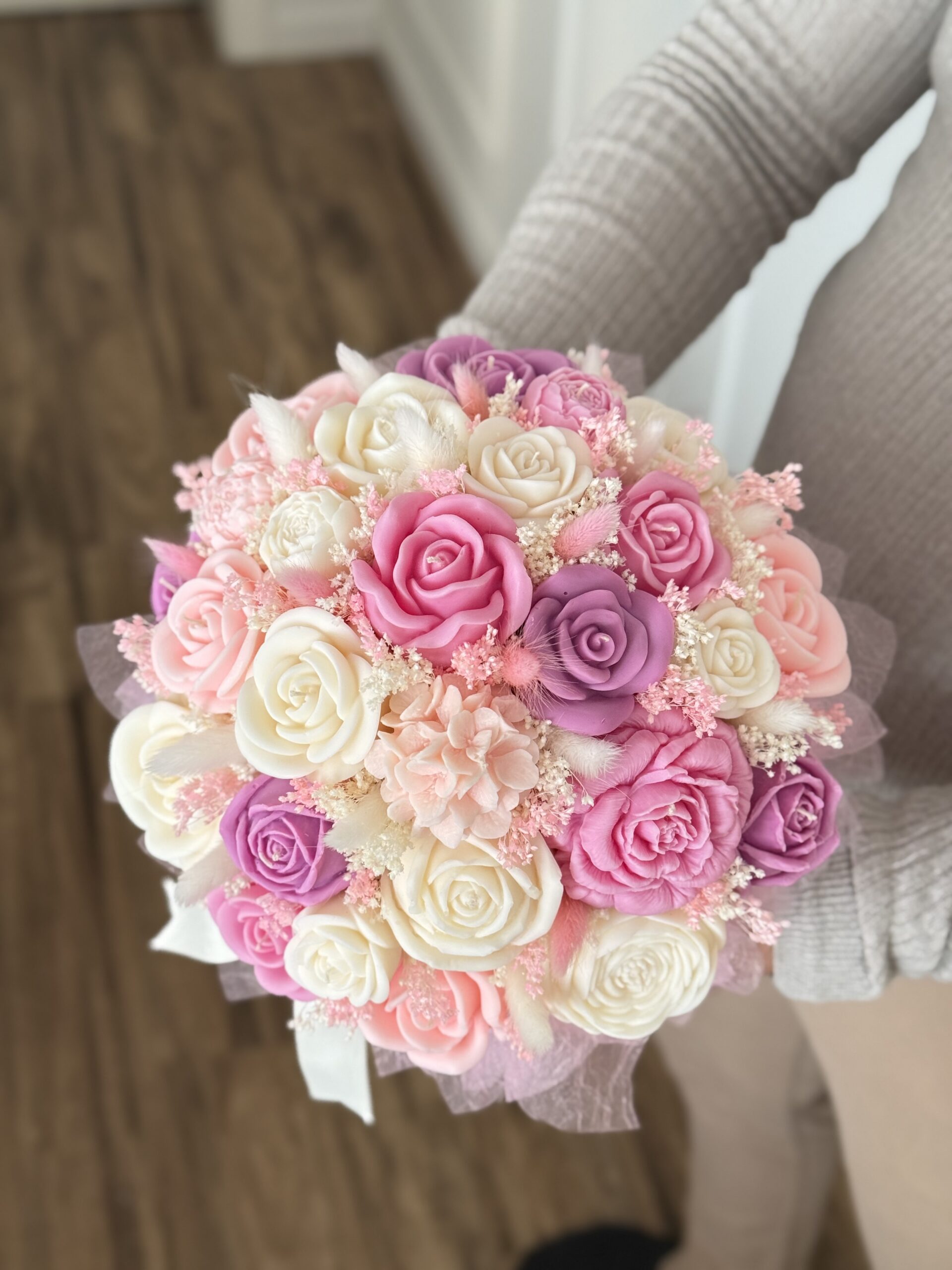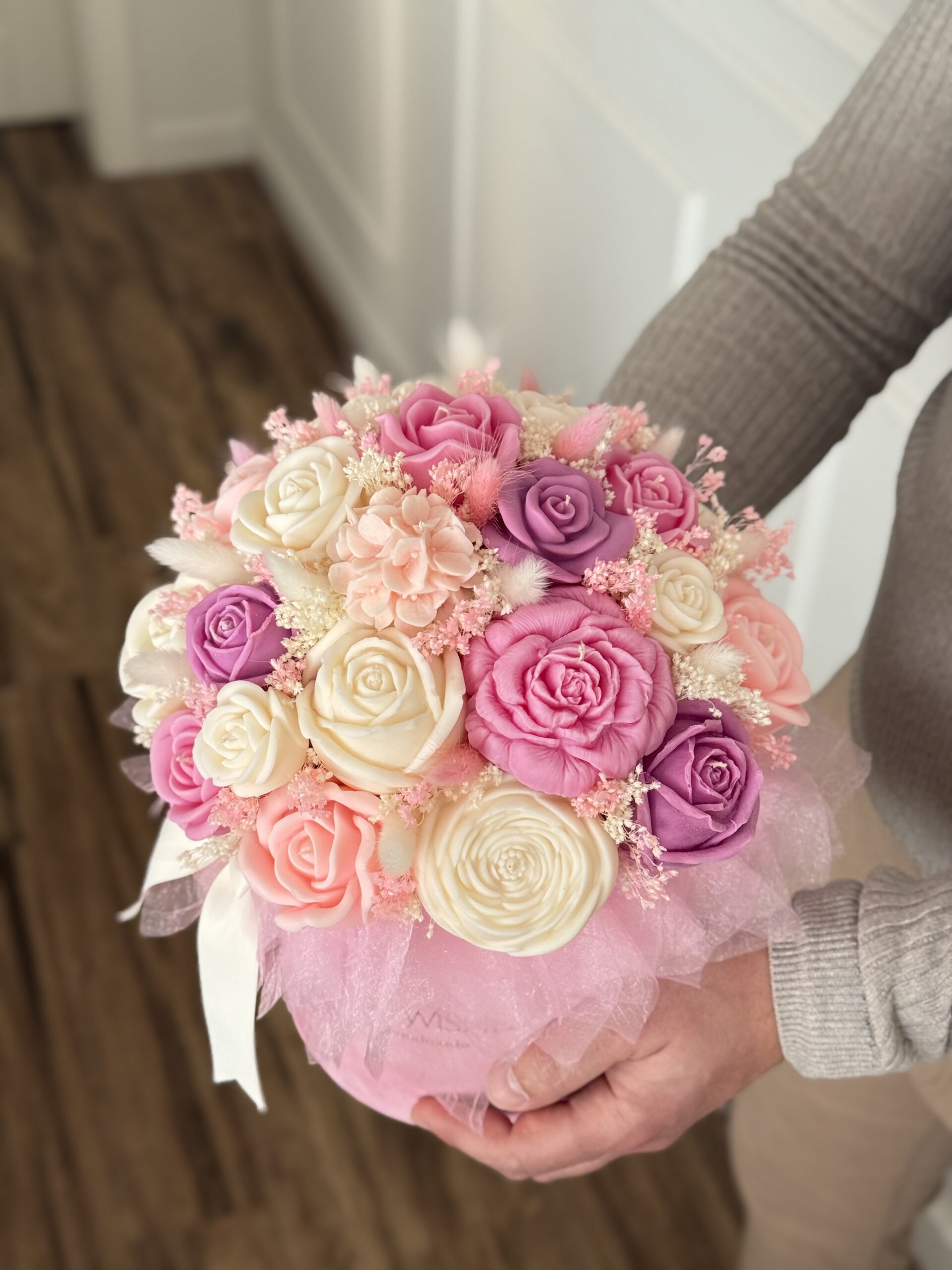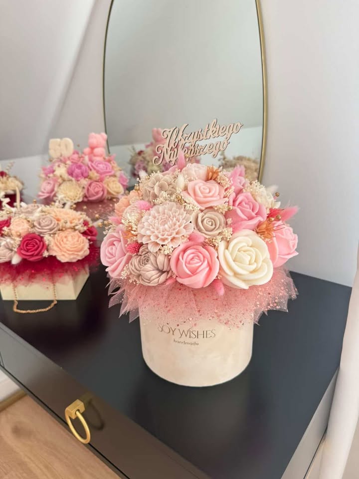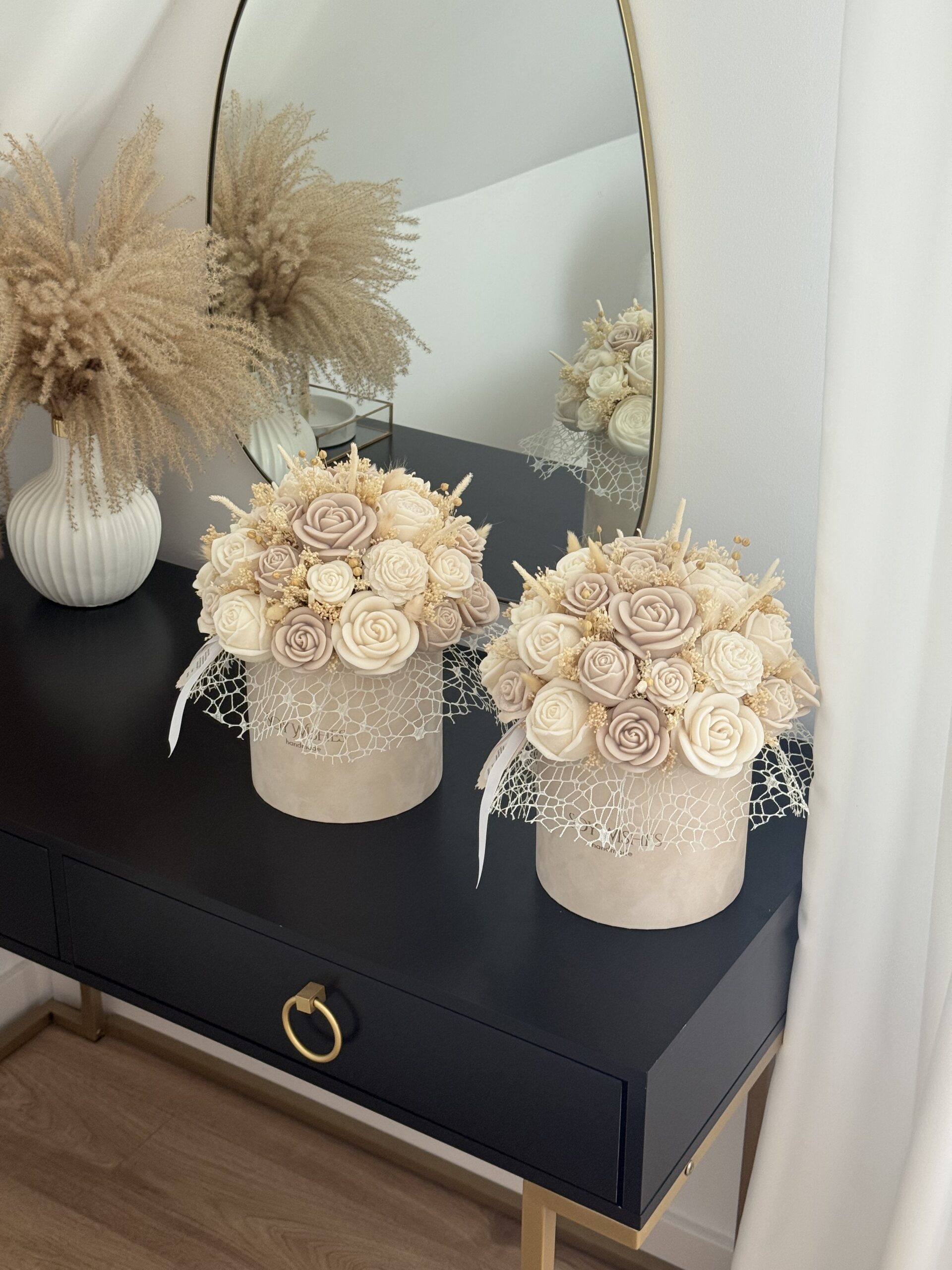 Flowerbox z wosku sojowego w eleganckim welurowym pudełku. Kompozycja doskonale sprawdzi się jako podziękowanie dla rodziców, prezent urodzinowy lub upominek dla pary młodej.